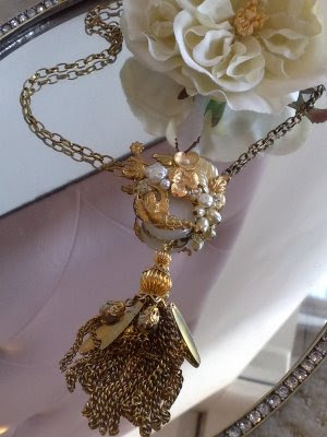 (vintage angel brass finding, 14kt gold flowers, freshwater pearls, faux pearls, vintage tassel piece, rhodium chain)